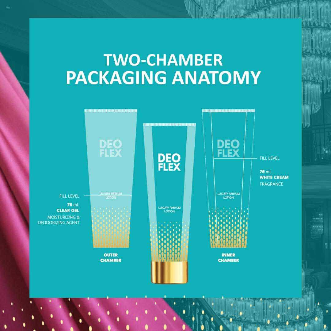 The Deoflex Luxury Parfum Lotion is a dual chamber product that combines three benefits into one. It's designed to provide a long-lasting scent of a luxury perfume, the moisturizing and skin lightening properties of a body lotion, and the odor fighting power of a deodorant gel.